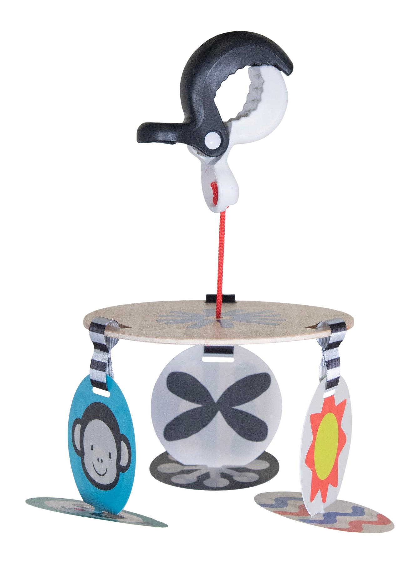 We’ve redesigned our best-selling stroller/carrier toy. It features six plastic cards (3 are reversible) that contain stimulating, research-backed, high-contrast images that will keep babies entertained wherever they go. The natural wood disk features a bullseye graphic on the underside for added visual stimulation. The toy attaches to most strollers and carriers with a black-and-white plastic clamp.